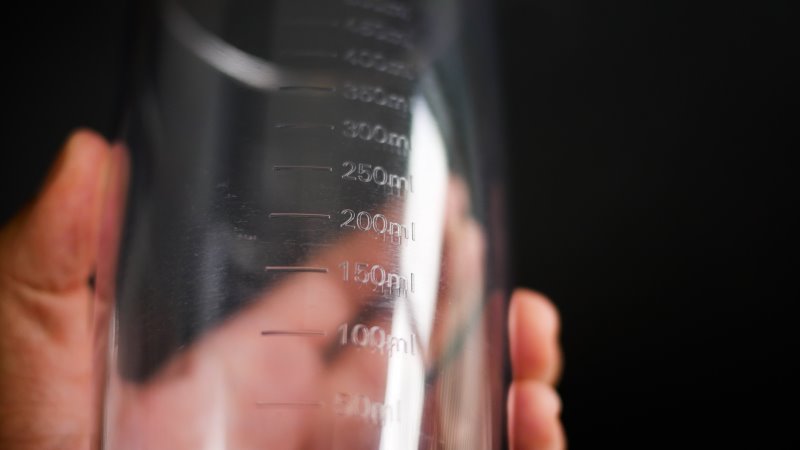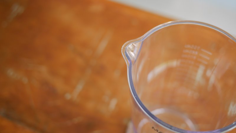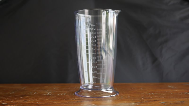 Este é um acessório bem comum em mixers, uma mistura entre copo e jarra, com bico para pôr líquidos. Nas paredes há marcações de volume que são bem precisas. É possível usar para medir porções até 700 mL.