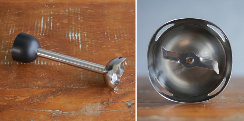 Por outro lado, a haste desse mixer Mallory é metálica. Feita de inox, o plástico rígido aparece somente no topo para fazer o encaixe com o corpo. Possui 19,6 centímetros e um conjunto de duas lâminas.