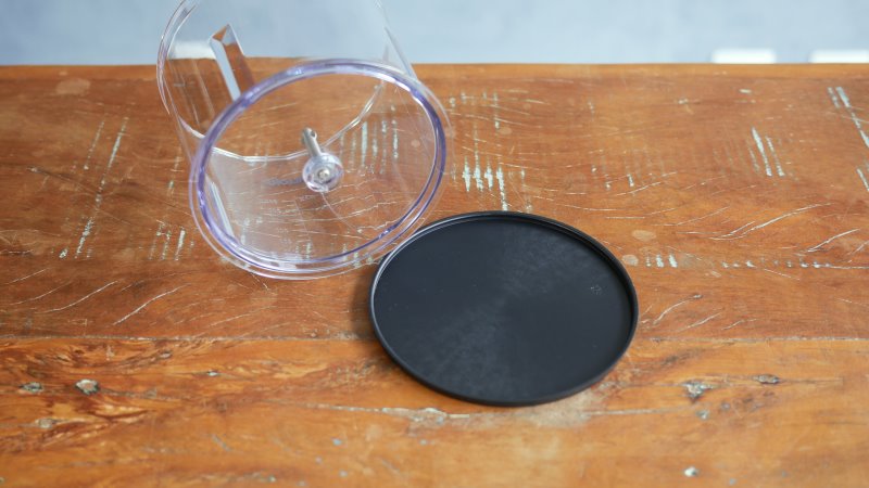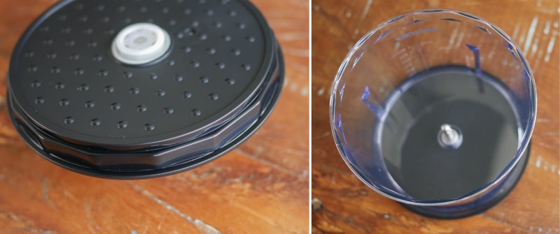 A outra tampa é mais simples, feita apenas para tampar algum ingrediente deixado no processador ou acoplá-la na sua parte de baixo. Fazer isso ajuda a reduzir as vibrações entre o processador e a mesa, diminuindo o barulho.