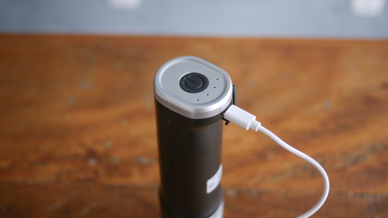 De acordo com nossas estimativas, a bateria desse mixer 4 em 1 tem autonomia para cerca de 1 hora e meia de funcionamento. Quando chegar a hora de carregar, a Mallory inclui um USB-C que se encaixa na parte traseira.