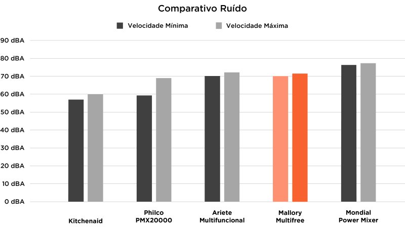 Comparando o esse mixer com outros, o Mallory Multifree é mais silencioso que a maioria. Registra cerca de 72 dBA na velocidade máxima.