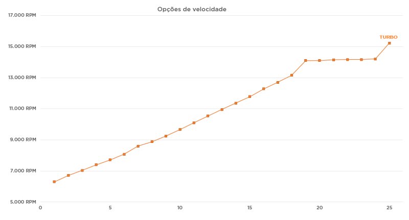 Apesar de haver 24 posições no seletor de velocidade, consideramos somente 11 velocidades com variação verdadeira entre elas. Ainda assim é possível ter uma boa variação da mínima para a máxima, chegando a quase 60%.