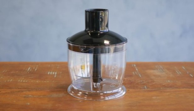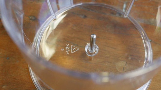 O processador é basicamente uma peça única em acrílico para encaixar o corpo. O copo tem espessura razoável, em torno de 3,5 milímetros. No centro há um pino para encaixar as lâminas.