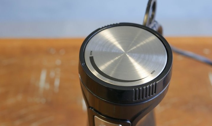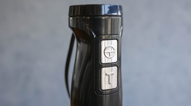 No corpo há dois botões para acionar as lâminas e um seletor giratório no topo para ajustar a velocidade. São botões que acompanham o desenho do corpo então para apertá-los é necessário afundar um pouco o dedo.