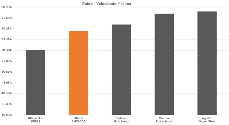 Na questão de ruído, o produto em velocidade baixa teve um bom resultado, ficando em torno de 59dBA. Não superou o KitchenAid, mas ficou melhor que a maioria. Na velocidade máxima subiu 10 dBA e acabou se distanciando ainda mais do ruído do KitchenAid. Assim mesmo, comparando com outros mixers, esse Philco está bem.