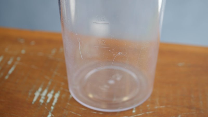 A haste pode ser usada na jarra inclusa de quase um litro até a boca. É um copo simples de acrílico em torno de 2,5 mm de espessura. Poderia ser uma peça mais espessa para suportar quedas. Há uma marcação até 600 mililitros que é fiel à medida real. Caso trabalhe com o produto em baixa rotação é possível ir até em torno de 800ml sem transbordar.