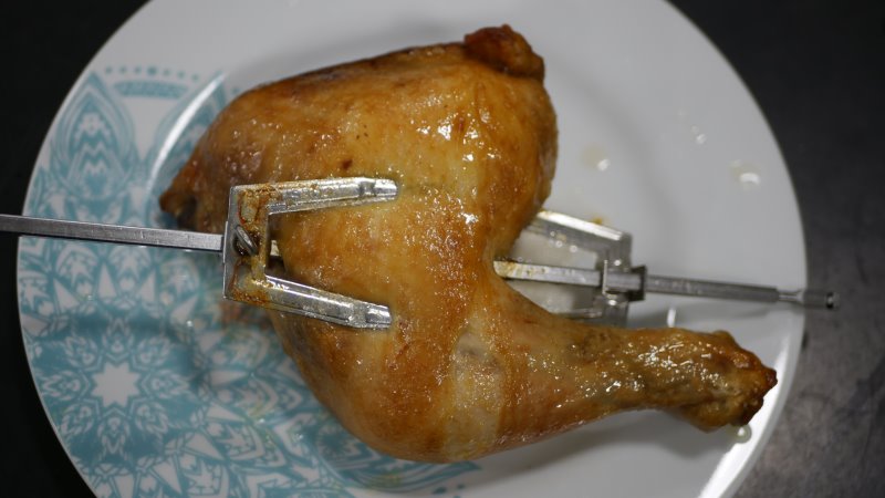 No preparo de frango usando o espeto grande o resultado também foi muito positivo. Demorou em torno de 35 minutos para atingir o ponto, mas a aparência e sabor do alimento estava superior a qualquer air fryer ou forno sem a função de rotação. Agradou mesmo.