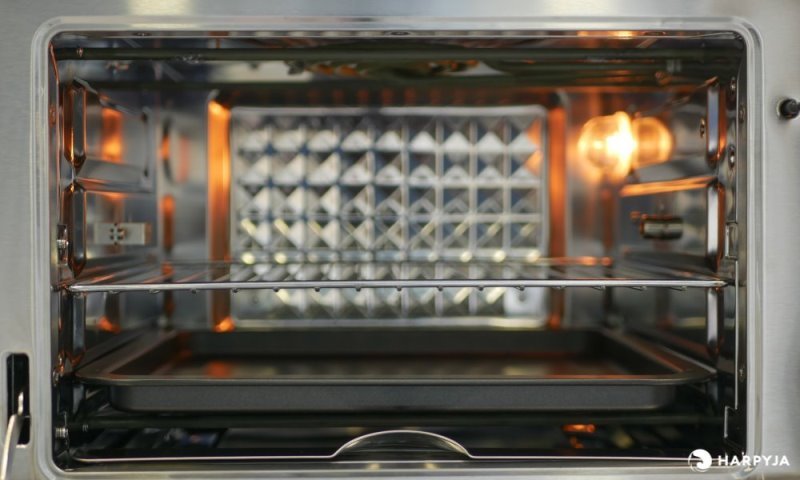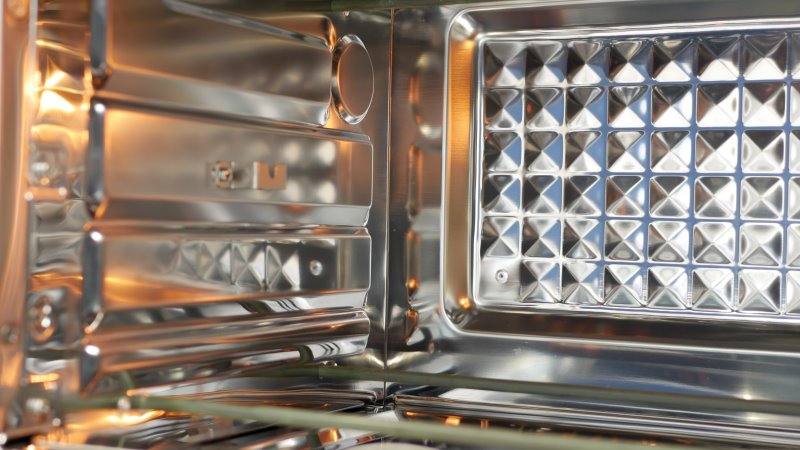 Internamente o design também agradou. Todas as paredes internas são de inox lustroso com o fundo trabalhado em um padrão com quadrados em alto relevo. Visualmente agrada e tira o efeito de espelho do fundo do forno. Há vários parafusos salientes espalhados pela cavidade, apesar de penar esteticamente é melhor que rebites, caso precise ser desmontado.