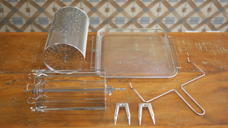 No geral são ótimos acessórios. Os espetos, bandeja anti-respingos e a cesto giratório e cesta são todos em aço inoxidável. A bandeja é feita de metal com um bom antiaderente.