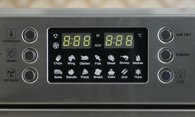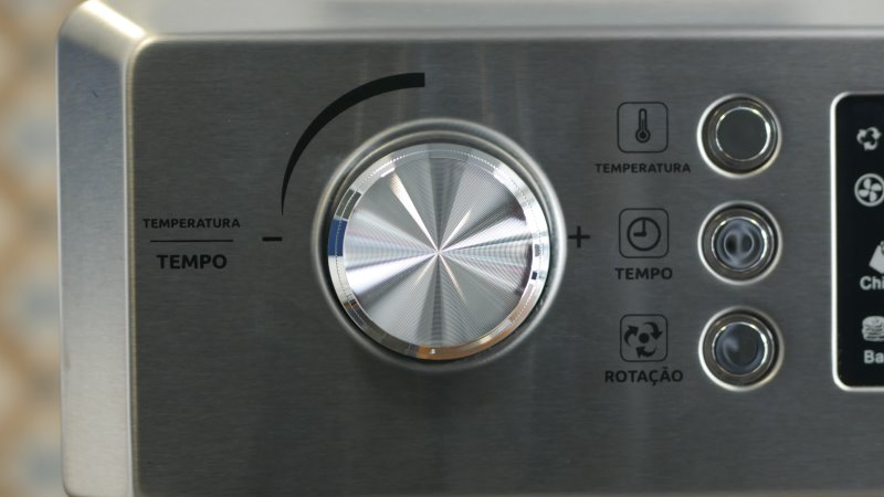 O funcionamento desta Oven Fryer é através de 8 botões e dois seletores. A estética do painel agradou, com seus seletores e botões em plástico cromado. A comunicação com o usuário é feita através da interface central com dois displays de 7 segmentos e vários ícones com LEDs para indicar a programação escolhida.