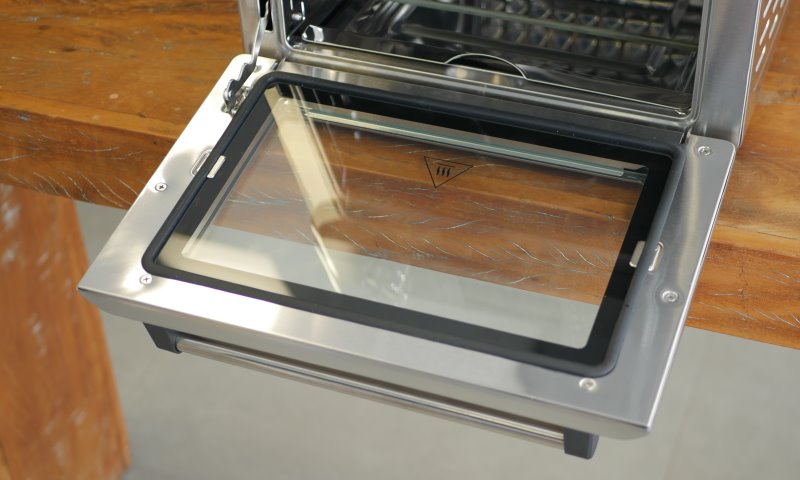 Uma das vantagens da Oven Fryer da Alliere comparada com grande parte dos fornos elétricos de bancada do mercado é sua cavidade interna ser inteira de aço inoxidável. Muitos produtos possuem chapa de aço galvanizada, algo consideravelmente inferior que mancha facilmente e ainda acaba tendo pontos de corrosão em poucos anos de uso.