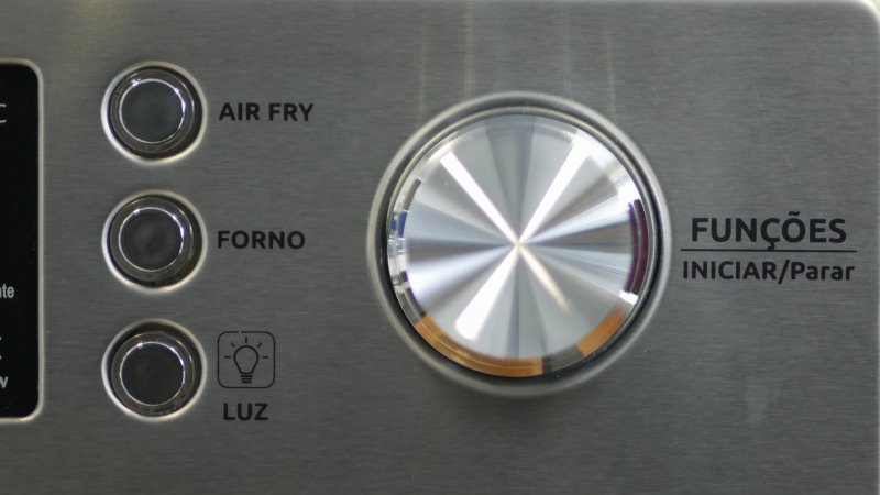 No lado direito é onde se escolhe os programas do Menu, apertando Air Fry ou Forno. O seletor é para se deslocar pelo menu e escolher o programa desejado. Também é utilizando o seletor que se liga, desliga e pausa a unidade. Por sinal, isso é algo confuso. É necessário pausar, ligar novamente para depois conseguir desligar. Além disso, depois de pausar e ligar de novo, se quiser pausar novamente será impossível. O forno irá desligar e perderá a programação. Poderia ter um controle diferente.