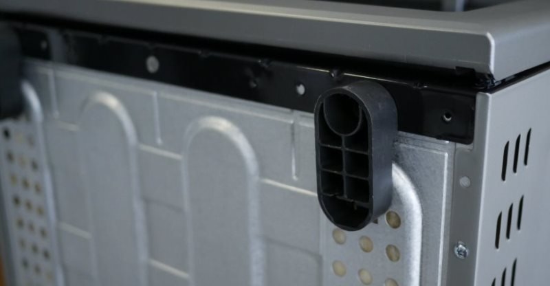 O cabo de alimentação tem 85 centímetros, poderia ser maior para evitar a necessidade de uma extensão. A vantagem é que o plug é em 90°, podendo até mesmo ser ligado atrás da unidade, desde que haja uma folga entre o plug e o forno. Por sinal, é importante ter esse espaço para que a chaminé (quatro furos atrás) possa trocar o ar com o ambiente.
