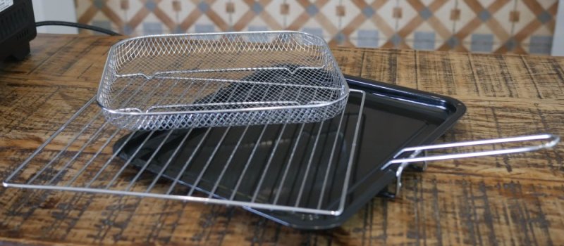 A bandeja vazada é para trabalhar em conjunto com a bandeja esmaltada para usar a função "air fry". Ela é de boa qualidade, um pouco desnivelada, mas atende bem o propósito.
