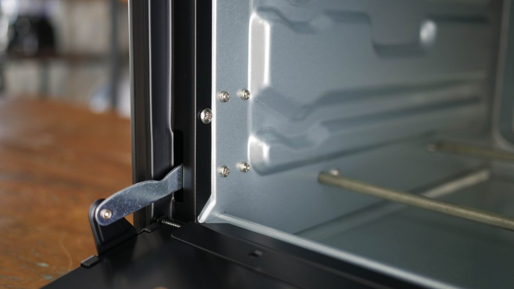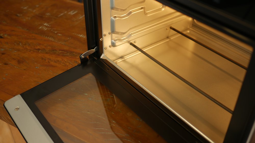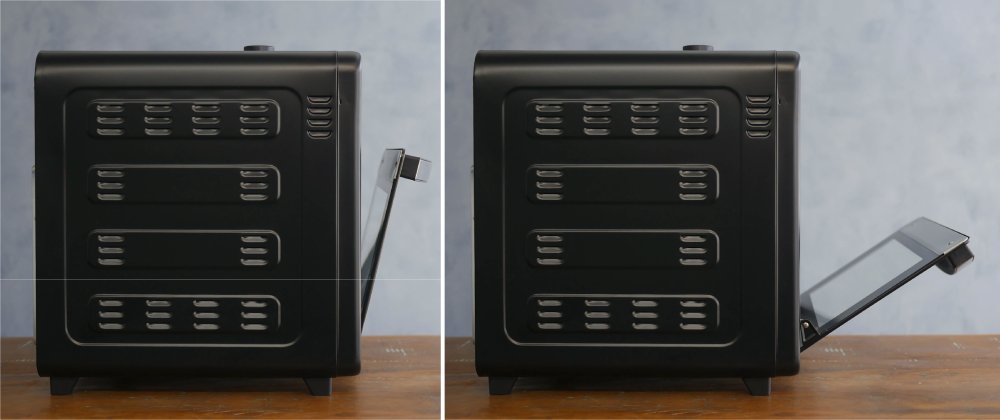 O exterior fica emoldurado em metal, porém o centro de vidro permite boa visualização do interior, tarefa facilitada pela lâmpada no interior. A porta tem duas posições de descanso para deixá-la entreaberta ao invés de fechar.