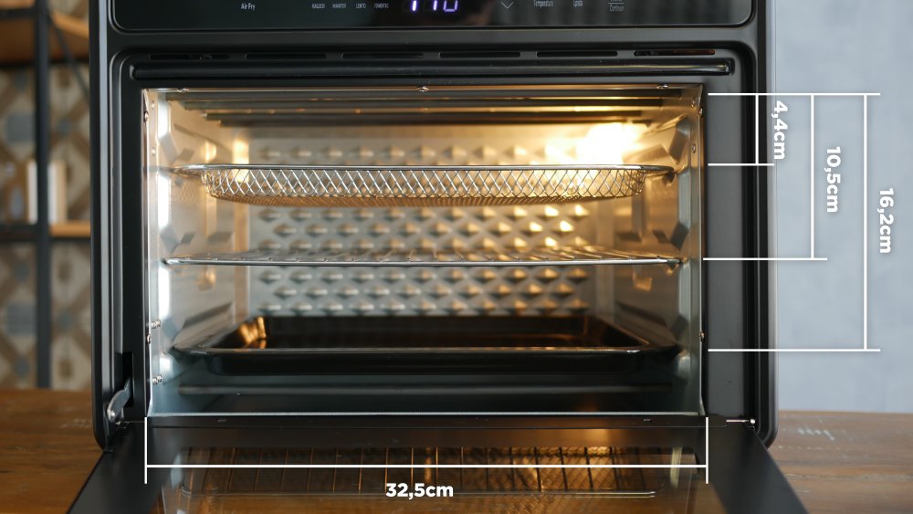 Com essas exceções, o volume útil marca 19 litros, próximo do Forno Air Fryer Oster que avaliamos. É um espaço de 24,7 centímetros de altura, 34,7 centímetros de largura e 34 cm de profundidade.