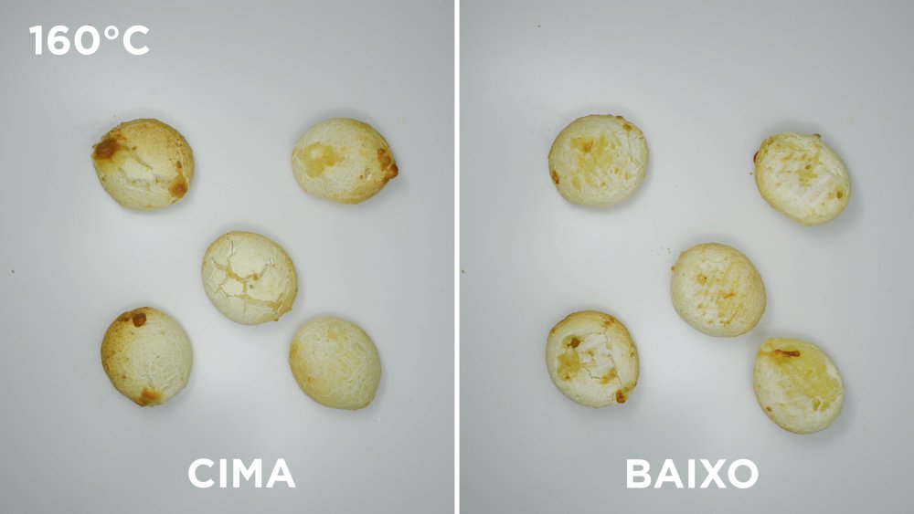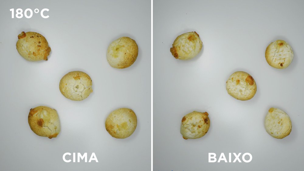 A princípio os pães de queijo estavam mal assados, com o centro um pouco cru, sem crocância e cor. Porém, subindo a temperatura de 160°C para 180°C os resultados melhoraram.