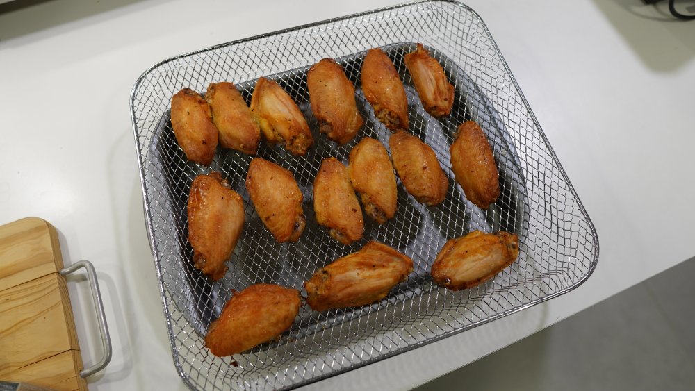 Durante o preparo de carnes, este forno air fryer EOS se mostrou capaz de dourar bem os alimentos. São realizados testes com hambúrguer e asinhas de frango, que ficaram bem douradas após 20 minutos em 230°C.