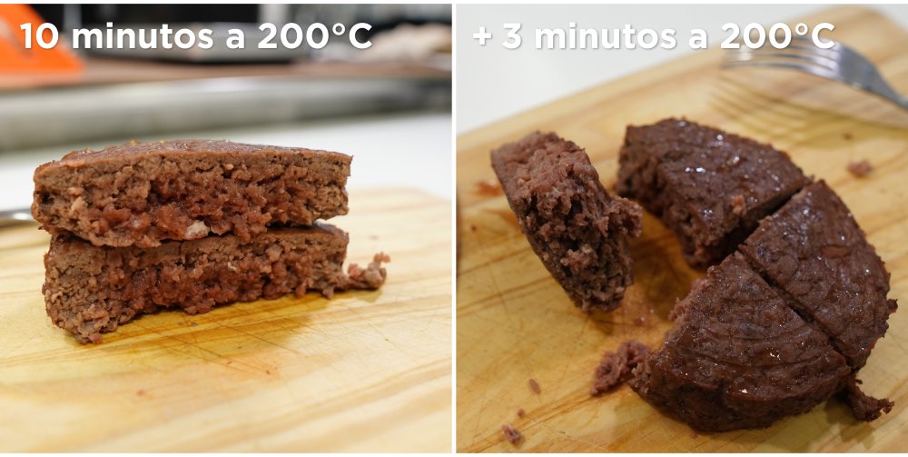 O interior porém, deixa a desejar se a carne for mais alta. No caso do hambúrguer, seu meio continuou cru com 10 minutos a 200°C. Adicionando mais 3 minutos de preparo, assou melhor, porém continuou mal passado.
