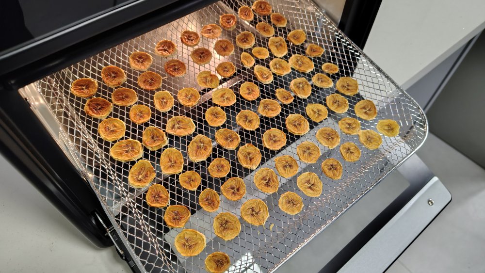 As bandejas também não auxiliam muito. É possível usar as três ao mesmo tempo para desidratar mais de uma só vez, porém dependendo do tamanho dos alimentos, fica difícil espalhar os alimentos na grade. O cesto também tem o péssimo hábito de colar em fatias de fruta.