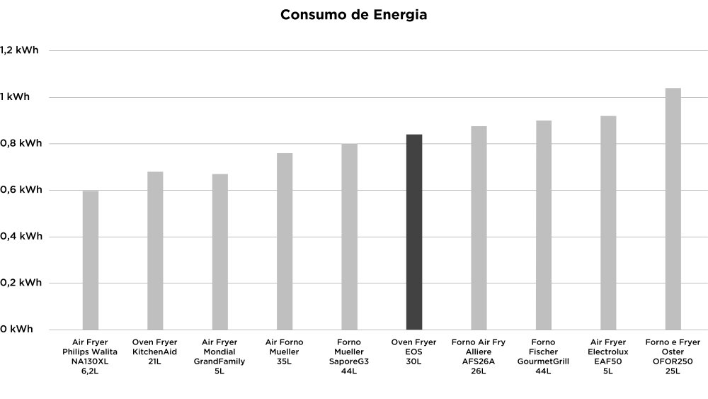 Comparando com air fryers, este forno air fryer tem um consumo de energia bem modesto. Se equipara a modelos com 5 litros de capacidade, como a Electrolux EAF50. Por outro lado, a falta de isolamento térmico o deixa bem atrás de fornos elétricos dedicados, consumindo similarmente a modelos de 44 litros.