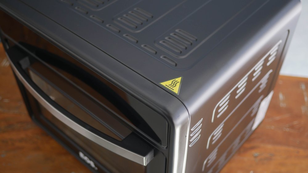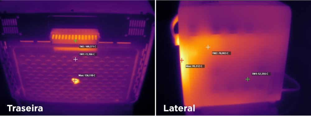 Outro efeito da falta de isolamento térmico são as altas temperaturas no exterior do forno air fryer. É comum que as laterais atinjam temperaturas de 80 a 93°C. A traseira é o local mais problemático, seja na chaminé a 100°C ou pouco abaixo, passando de 150°C. Não deixe encostado contra a parede nem permita cabos de alimentação próximos.