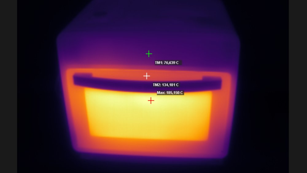 Na frente, a situação não melhora muito. A porta de vidro simples e moldura metálica atinge as temperaturas mais altas de todo o conjunto: 185°C no vidro e 133°C no metal. O pegador fica quente, mas não o suficiente para queimar. Ainda assim, logo atrás do pegador há temperaturas altas, e mesmo o plástico perto das junções com a porta atinge 100°C.