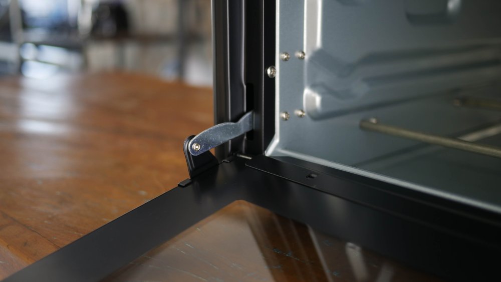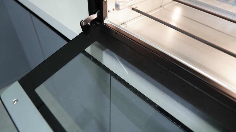 A porta se abre de cima para baixo, feita por uma chapa única de vidro. Há somente uma dobradiça, que pode deixar a porta bamba ou o fechamento frouxo com uso prolongado.