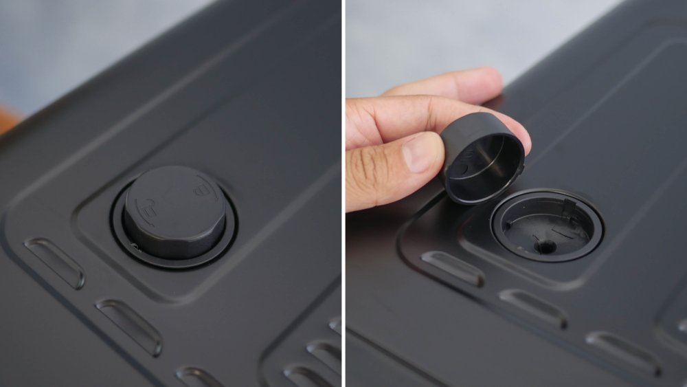 Logo acima tem uma tampinha que pode ser retirada para derramar água e gerar vapor no interior do forno. É algo benéfico para assar pães, por exemplo.