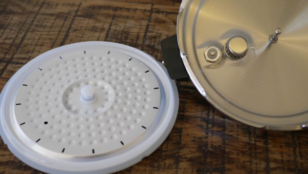 A tampa é de inox com alça plástica. Dentro da tampa há uma peça extra que segura a borracha de vedação. É uma peça de alumínio super simples, até aparenta ser frágil. Ela serve para diminuir a chance de entupimento da válvula de controle de pressão. Assim mesmo, há uma proteção a mais na válvula de controle de pressão. Na tampa também tem a válvula de controle de pressão que é removível.