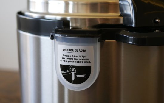 Há uma peça plástica para coletar a água que pode ficar acumulada entre a panela e a tampa. Raramente pinga água neste local pois a tampa veda 100%.