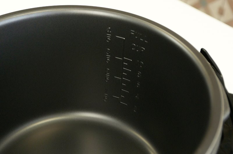 Dentro da panela também tem uma marcação em copos e em fração do volume total. Essa marcação fracionada está corretamente marcada, sendo cada um quinto igual a um litro de água.