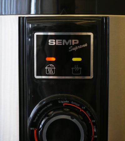 O seletor é somente um timer que varia de zero a noventa minutos. A Semp colocou sugestões de alimentos a cada dez minutos de intervalo, mas isso parece mais para preencher espaço do que realmente para ser utilizado a risca. O timer é similar aos fornos elétricos, gerando um leve barulho durante o funcionamento. Quando o ciclo termina, o timer bate um sininho.