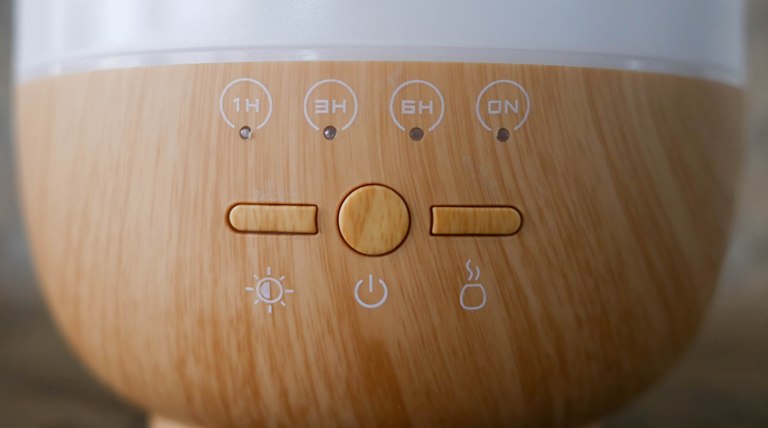 - O botão central liga e desliga o difusor, além de permitir escolher o tempo que o produto ficará ligado. Quando ligado se segurar o botão o produto desliga, e se apertar rapidamente ele acende o LED correspondente ao tempo que irá funcionar antes de desligar sozinho.