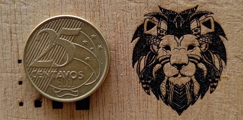 O LaserPecker LP2 tem 2k de resolução, o que se traduz para 20 pontos de laser por milímetro linear. É possível obter ótimos resultados, principalmente quando trabalhando com figuras vetoriais com uma cor só. Abaixo é um exemplo feito na madeira.