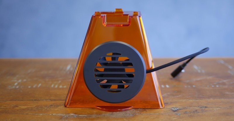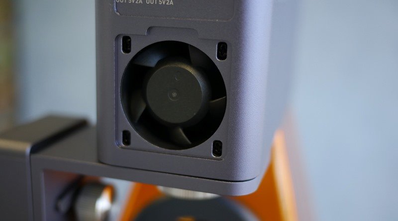 Acoplado ao acrílico, um ventilador na parte de trás se conecta nas saídas do aparelho através de um cabo USB. Ajuda na liberação de gases e fumaça.