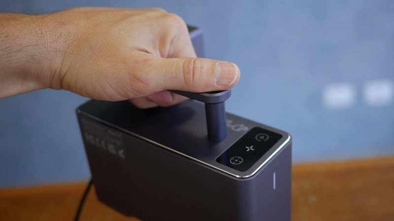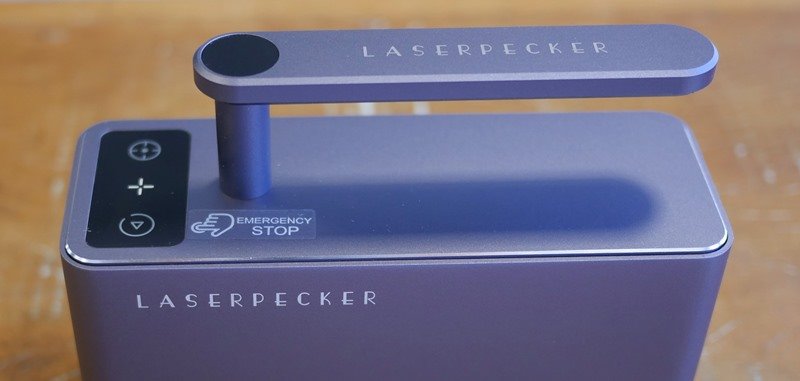 Na lateral tem-se os botões de ajuste de altura e o indicador de que ele está ligado. A LaserPecker entregou um mecanismo de regulagem compacto, tudo em uma haste única e discreta. Toda a estrutura superior, cabeça e cone protetor do laser são sustentados por esta haste.
