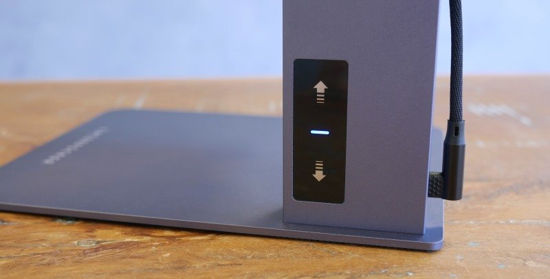 O controle de altura pode ser feito por software ou por dois botões touch que ficam na haste. É possível acionar continuamente por um toque longo ou com regulagem de 1mm por um toque curto, tanto para cima como para baixo.