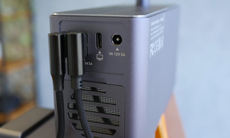 Na traseira da cabeça é onde ficam as entradas e saídas de energia, assim como a entrada de ar para o resfriamento do circuito do laser. No total são duas portas USB para saída elétrica, uma USB-C para comunicação com o computador e uma conexão para alimentação do aparelho.