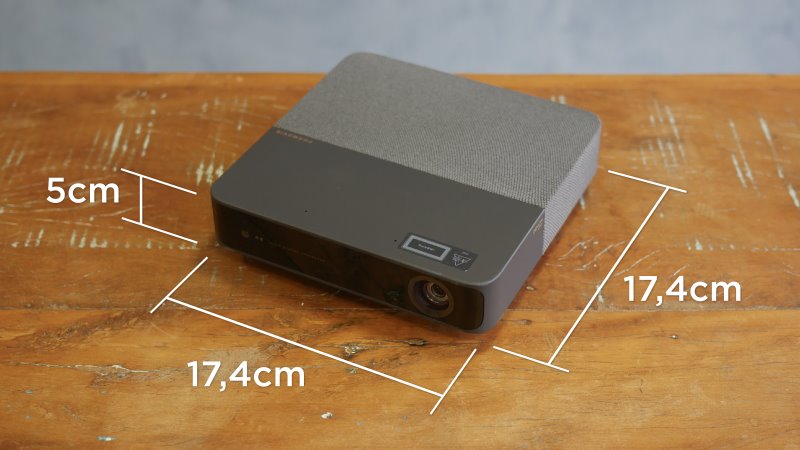 A Formovie foi capaz de explorar curvas, texturas e materiais diferentes em uma unidade compacta e discreta. O projetor quadrado mede 17,4 centímetros de largura e profundidade, e somente 5 centímetros de altura! Cabe em qualquer mochila pequena.