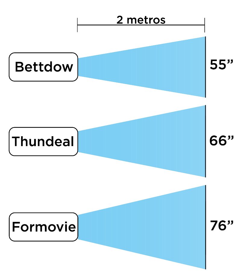 Considerando a distância ideal para termos as leituras e linhas bem definidas, podemos dizer que a uma projeção de 80 polegadas se mantém nítida. Assim mesmo, é possível usar uma tela de até 140 polegadas para uma ótima sala de cinema!