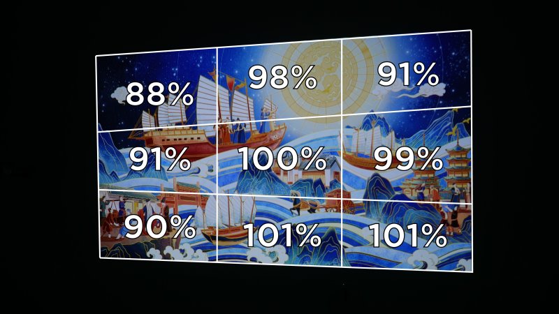 Nos testes de brilho o Nothing Projector tem um brilho máximo abaixo dos projetores de LED que testamos no passado. Assim mesmo, sua projeção é uniforme, com variação máxima de brilho de somente 12%. Nos projetores de LED isso é bem diferente, com perdas grandes nos cantos. O melhor que testamos de LED ainda tem perda acima de 30%!