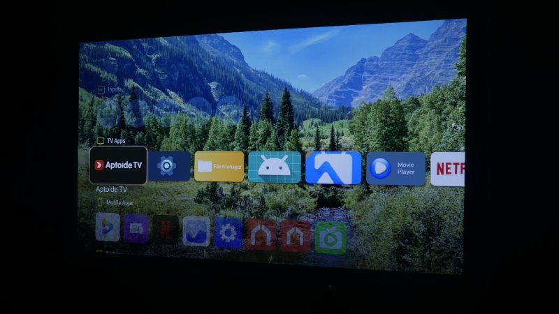 Seguindo as instruções que vieram junto ao produto, é necessário instalar um outro programa, o Projectivity Launcher. Esse é em inglês e a interface é mais parecida com os que vimos em outros projetores já testados, como o Thundeal e o Bettdow. Através dele é permitido baixar aplicativos como Netflix e Youtube.