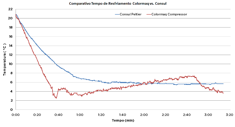 O consumo do sistema de Peltier é muito diferente do comportamento do sistema com compressor. Seu consumo é consideravelmente alto quando resfriando e quanto mais próximo chega da temperatura desejada menor fica seu consumo. O compressor trabalha com uma potência quase fixa até atingir a temperatura desejada. Assim que atinge a unidade desliga o compressor. Nesse estado ele fica ligando e desligando baseado na leitura de temperatura interna. O que acabou acontecendo é que o consumo do Consul foi consideravelmente mais alto para resfriar e muito parecido com o sistema de compressor para manter a temperatura. Como é um produto que demora para resfriar, em ambientes onde há muitas extrações de água, o consumo registra acima ao EOS e Colormaq testados anteriormente.