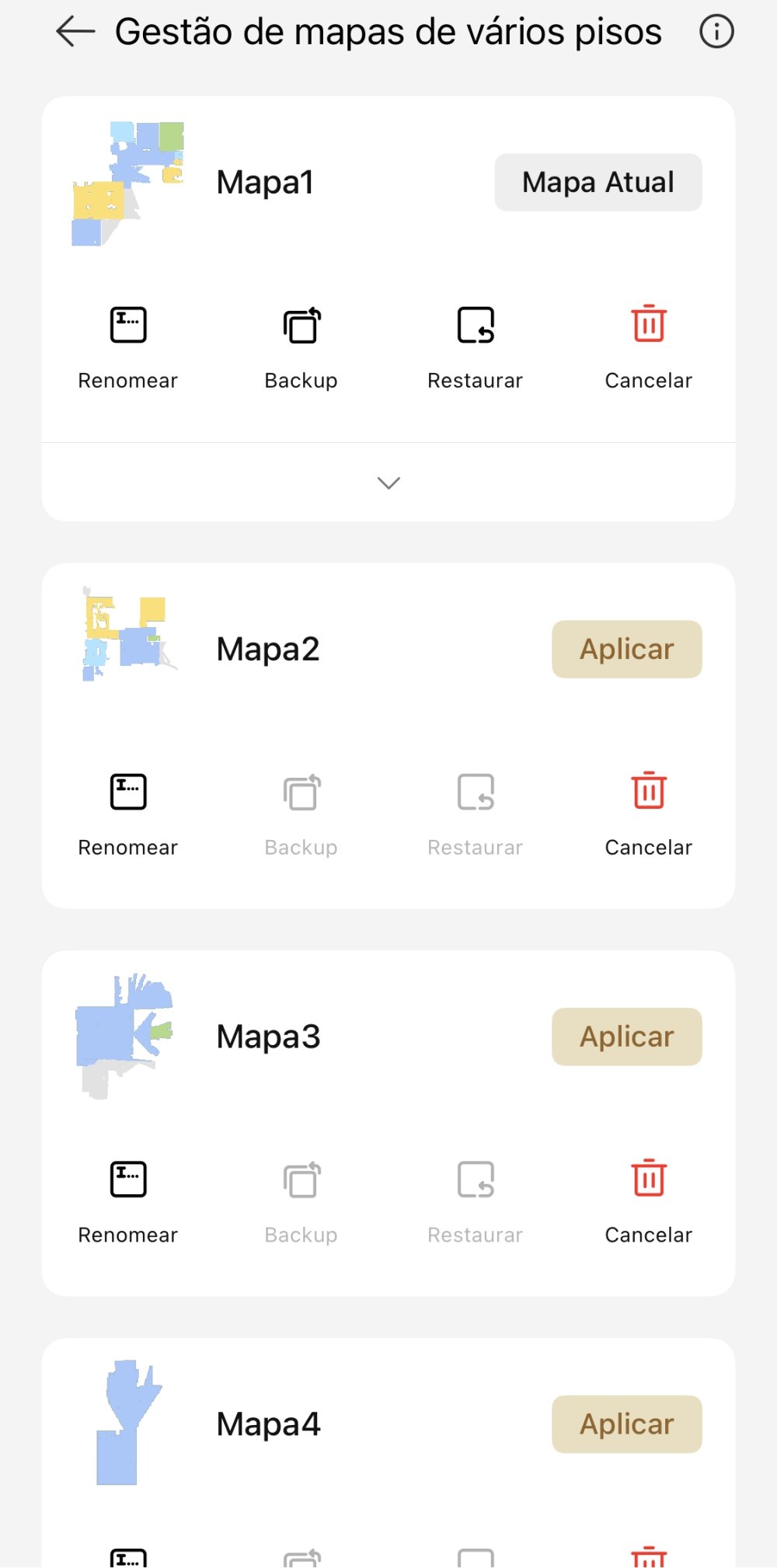 Caso queira ter mais de um mapa salvo no mesmo robô, talvez sua casa tenha mais de um andar, é preciso ativar o modo “Pisos Múltiplos”.