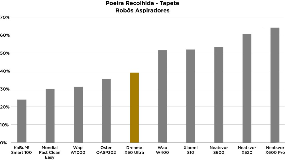 Com tapetes, porém, deixa a desejar. Não importa a configuração, a coleta de pó ficou atrás de outros robôs que realizam mapeamento. O resultado sobe na força de sucção máxima, porém ainda há melhores.