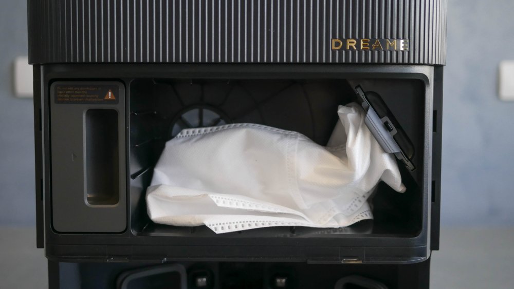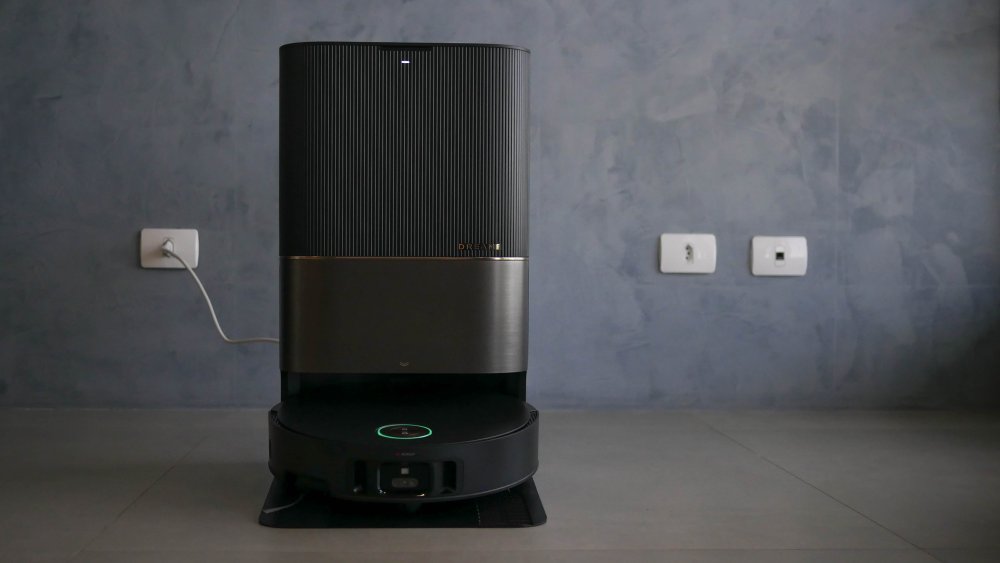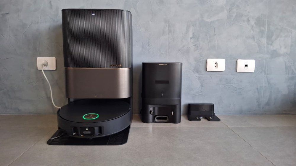 Nos entornos há contatos elétricos para o carregamento e uma abertura por onde é feita a sucção da poeira aspirada pelo robô. A base serve como um “aspirador do aspirador”. Por isso o Dreame X50 Ultra tem um alçapão de silicone na traseira.