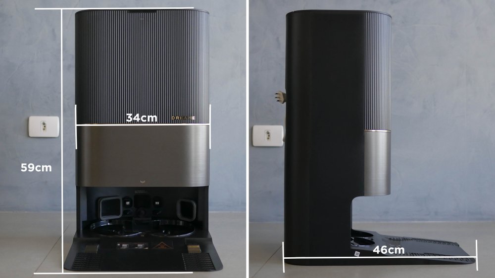 O espaço demandado para a base é grande. A unidade soma 59 centímetros de altura, 34 cm de largura e 46 cm de profundidade. Precisa de folgas nos entornos para que o robô consiga encontrá-la e ter acesso sem obstáculos.
