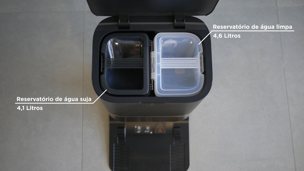 Para fazer isso, conta com compartimentos separados para água Limpa e Suja, para o Produto de Limpeza e um Saco de Pó que acumula a sujeira aspirada pelo robô ao longo de semanas.