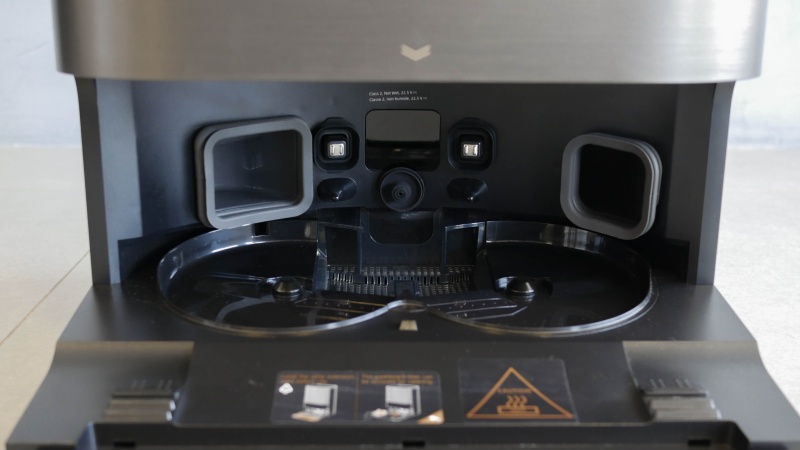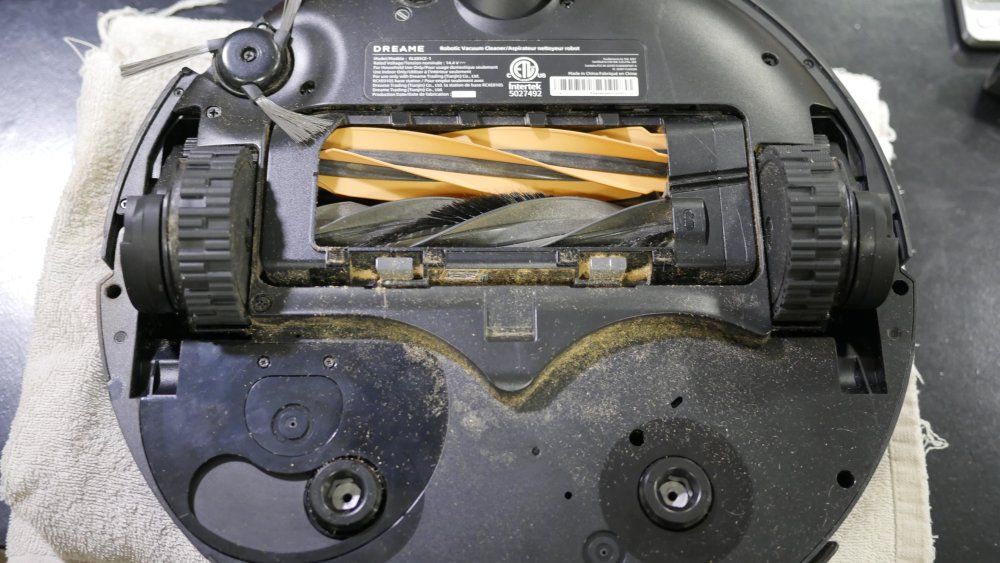Essa lavagem é feita diretamente abaixo de onde os esfregões são mantidos fora de uso. Ali uma peça perfurada serve de filtro para detritos maiores que foram coletados pelo robô durante suas limpezas.